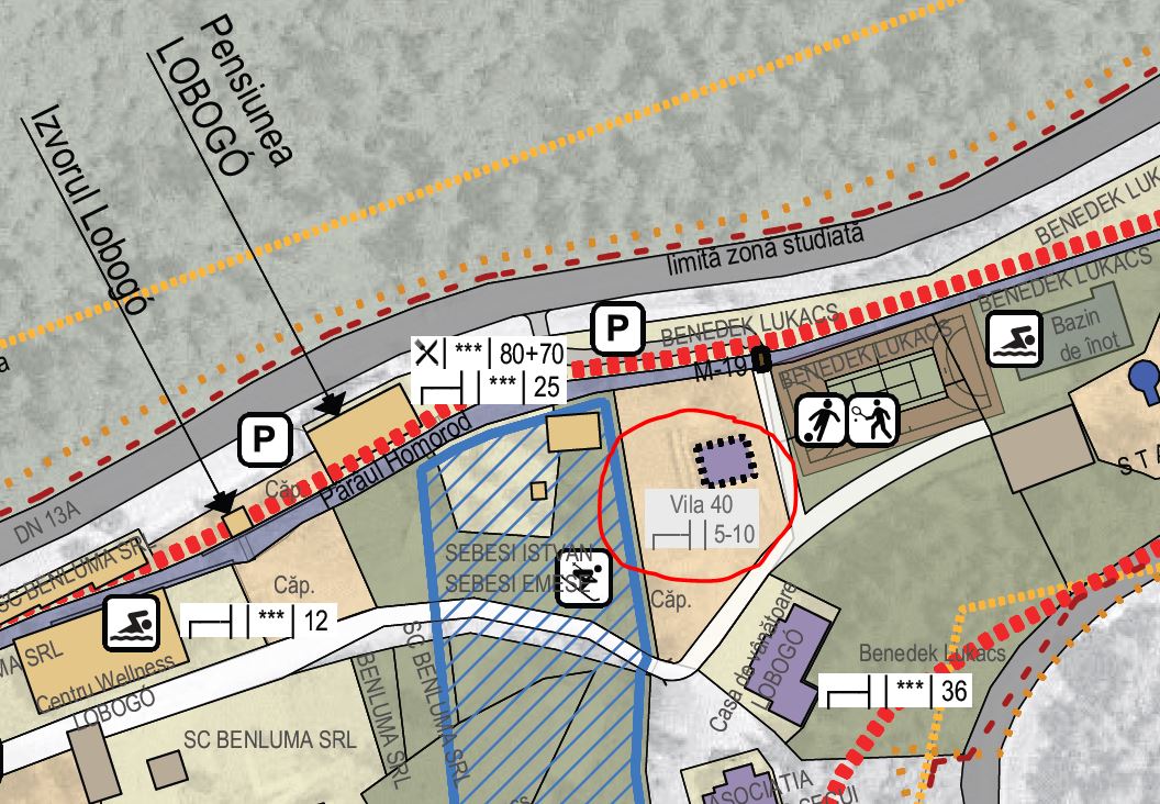 A fentebbi térkép alapján, melyet a fejlesztési tervből emeltem ki, a 40-es villa önkormányzati területen állt a Lobogó komplexum kellős közepén. Keleten Benedek Lukács teniszpályája, délen Benedek Lukács vadászháza, nyugaton Benedek Lukács sípályája, északon pedig a Benedek Lukács által szabályozott Homoród pataka, azon túl pedig Benedek Lukács területe.