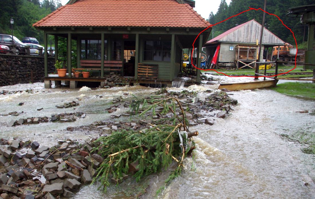 Az árvízkárokat alátámasztó képeken úgy látszik, hogy egy nagyon furcsa jelenség történt: nem az épület alja rogyott meg, hanem az aránylag ép tető zuhant rá az épület aránylag ép aljára. Furcsa, hogy így viselkedik egy faépület, nem jellemző. Nagyon magas árvíz lehetett, hogy az aljával összeácsolt tetőt lemozdította az épület törzséről, amit nem vitt el.