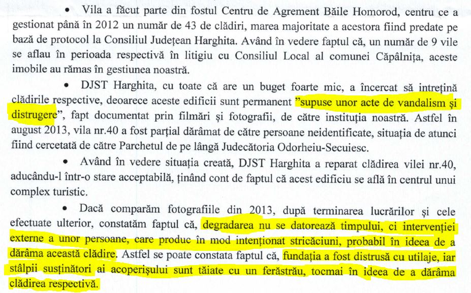 A villa valakinek nagyon útban volt. A HMSIH egy, a polgármesternek küldött átiratban arra panaszkodik, hogy az épületet 2013 augusztusában valakik nagyon megrongálták. Akkor a tulajdonos hatóság, a HMSIH elfogadható állapotba hozta. De utána valakik folyamatosan tovább rongálták az épületet, szerintük azzal a céllal, hogy összeomoljon. Az alapot gépekkel tették tönkre, a tető tartóoszlopait fűrésszel vágták el. Nem lehet tudni, hogy ki.
