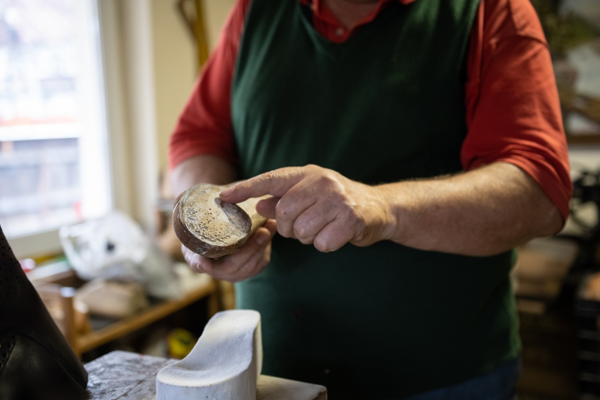 A cipőkészítés első és legfontosabb lépése a mintavétel: szembe kell nézni a kuncsafttal, milyen dőlési szöge van a lábának, milyen a testtartása, hogyan jár. János bácsi mindenkit megkér egyszer, hogy sétáljon egyet az udvaron, addig ő megfigyeli a járását. „Az a lényeg, hogy a cipő ne csámpásítsa az embert, mert elég csámpás magától is” – magyarázza.