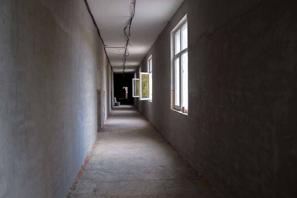 A kábelek már be vannak vezetve, a konnektorok beszerelve. „Most fel lesz teljesen takarítva, jönnek a vízgázszerelők, mert be kell kerüljenek a csővezetékek, fűtőtestek. Ezután következik a kiegyenlítő, felső betonréteg, a padlózat, és újrasimítják a falakat” – ad helyzetjelentést az igazgató. Elmeséli, hogy az alvállalkozók is nagyon korrektek, lehet velük beszélni, hisz amikor megérkezett a vízmértékkel és szólt, hogy van egy 3 centis eltérés, így lejteni fog a padló, a főnökük utasította a munkásokat, hogy újra kell csinálni.