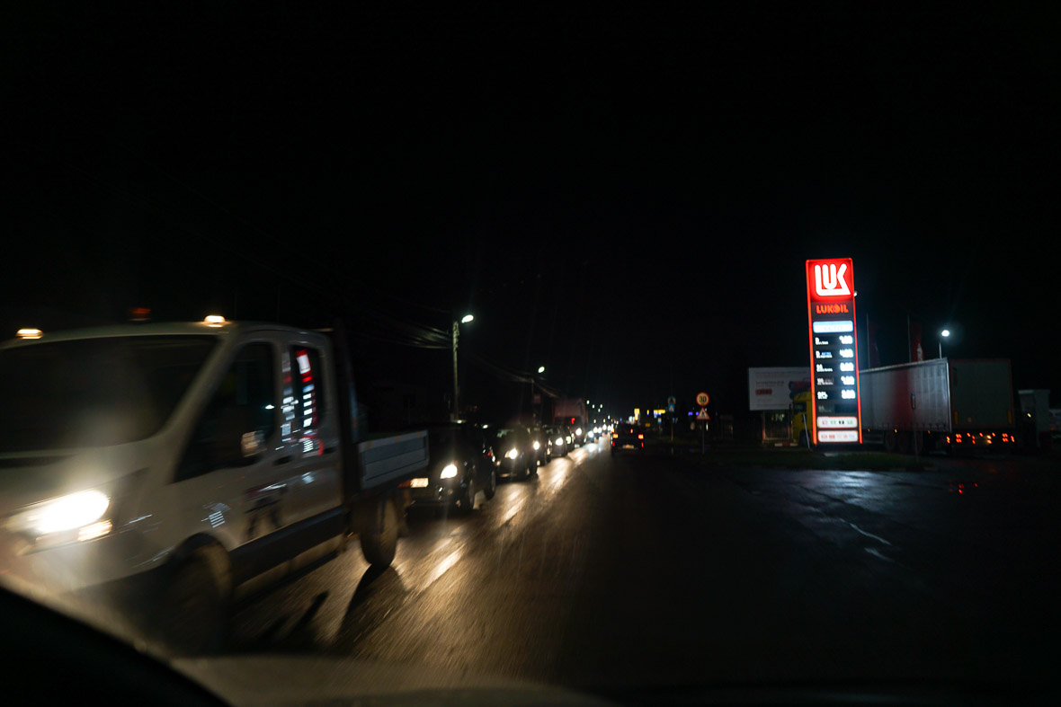 Kerültünk még egyet, feljebb. Sötétben, esőben, spontán kialakult kis dugókban, kóválygó autók között. Mit tehetünk, ha az egyszerre zajló két aszfaltozást és egy csőcserét nem lehetett úgy tervezni, vagy úgy időzíteni, hogy egyik ne nyomja a másikra a forgalmat.