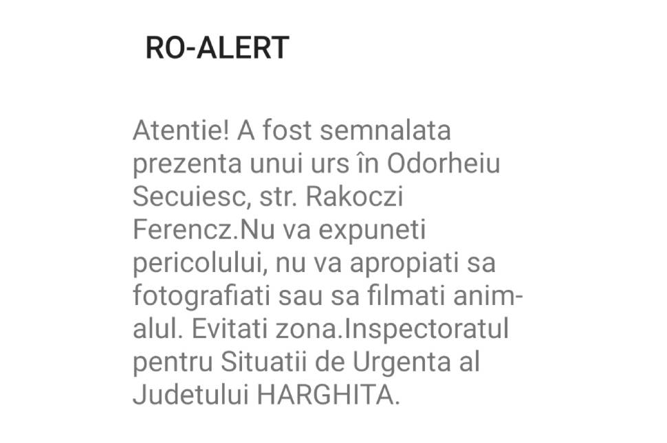 Hétfő este Ro-Alert sms üzenetben figyelmezették néhány perccel 8 előtt a II. Rákóczi Ferenc utca környékének lakóit, hogy medve jár a közelben, kerüljék a zónát, az állatot ne fényképezzék, filmezzék stb.