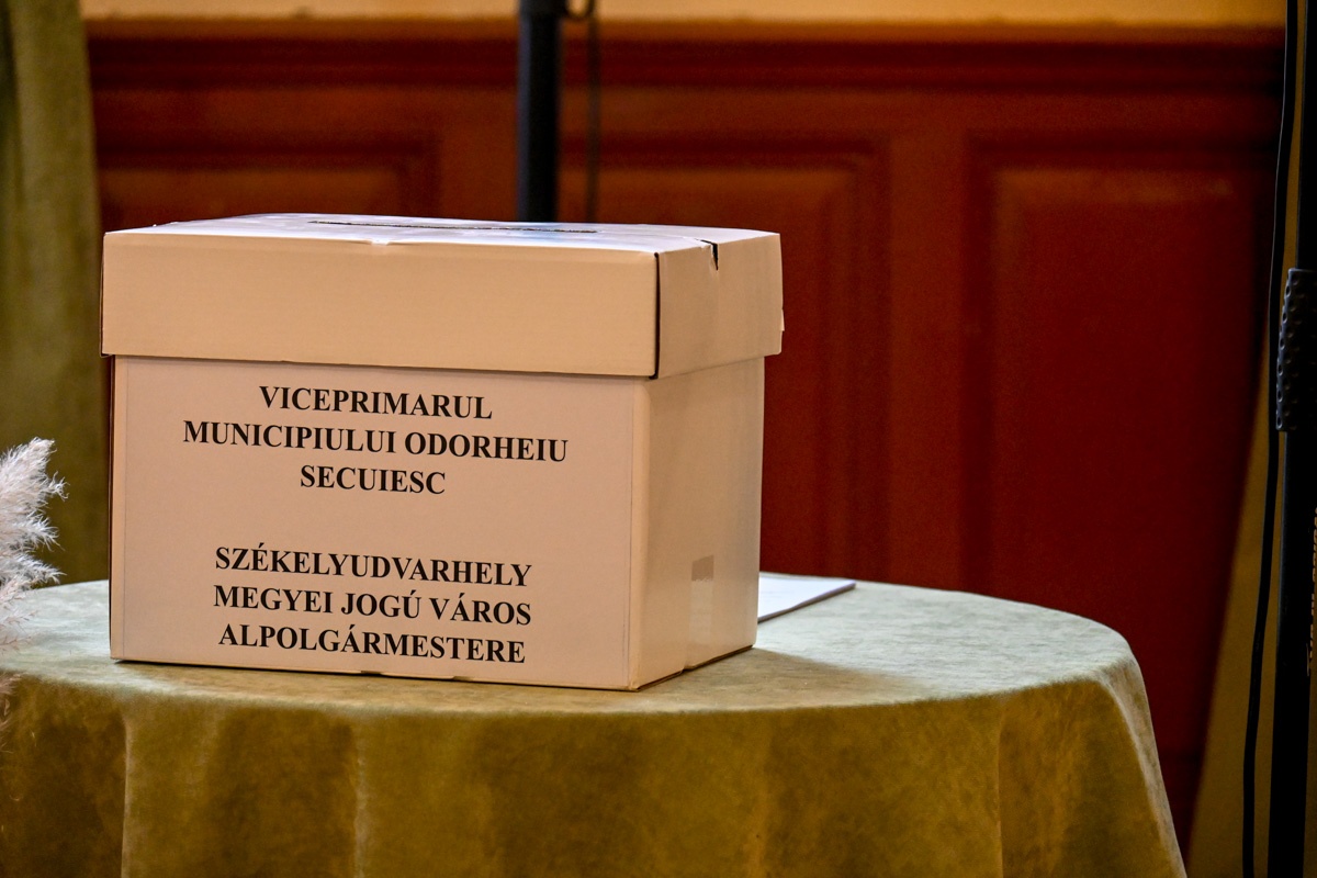 Venczel Attila főjegyző felolvassa az eskü szövegét román, majd magyar nyelven, aztán ugyanezt az RMDSZ-es Boros Viktória, az SZP-és Élthes Előd Etele, majd a szintén RMDSZ-es Jakab Zoltán is elmondja. Mindenkit állva hallgat, aztán megtapsol a közönség. Ezzel Székelyudvarhely városa 18 megválasztott és mandátumérvényesítéssel rendelkező tanácsossal rendelkezik, jelenti be a főjegyző.