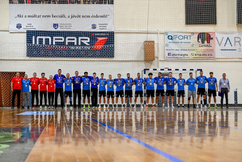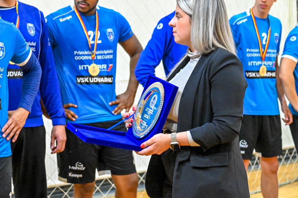 A lefújást követően Sorin Dinu, a Román Kézilabda Szövetség alelnöke és Gálfi Árpád, Székelyudvarhely polgármesetere adta át a bajnoki érmeket, illetve az emlékplakettet a tényt igazoló felirattal, miszerint a VSK Székelyudvarhely a 2023–2024-es idény bajnoka.
