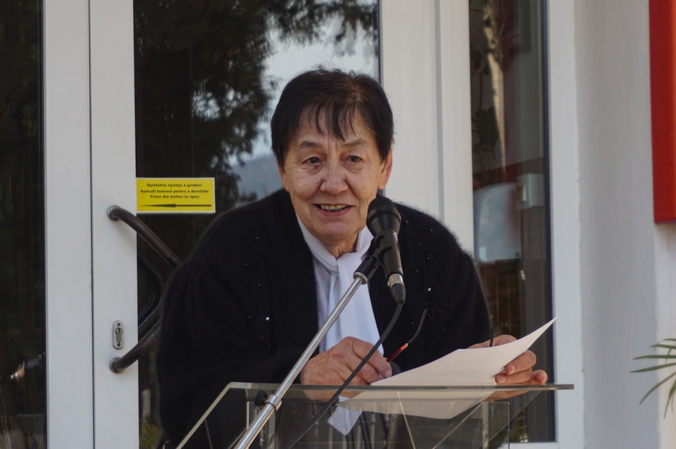 Aztán a volt tanárok részéről Szász-Mihálykó Mária következik, aki nekünk egy-két évig franciatanárunkként volt ismerős a kilencvenesekben. Arról beszélt, hogy bár nem itt kezdte, az iskola egyidős a tanárságával, édesanyja is itt volt tanító, ezért jó sok szállal kötődik hozzá és mesélni is tud róla.