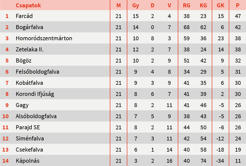Az 5. Liga Udvarhely körzeti csoportjában Farcád előnye öt pont az élen. Bogárfalva követi a második helyen, négy pont lemaradással Homoródszentmárton áll a harmadik pozícióban. Zetelaka csak a gyengébb gólaránya miatt a negyedik. A csoportban még öt fordulót rendeznek, kiélezett harc várható a dobogós helyekért.