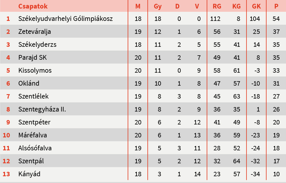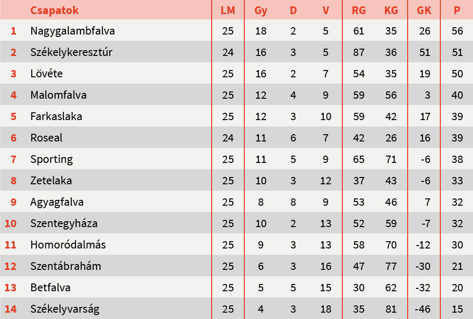 Egy győzelem kell Galambfalva bajnoki címéhez. A körzetiben tovább folytatódik a harc a dobogós helyekért. Mutatjuk a tabellákat.