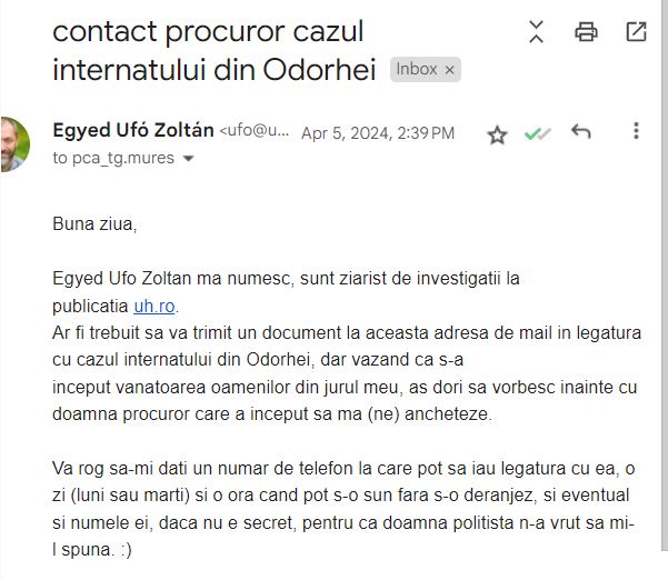 Elkezdünk beszélgetni. A hölgy elmondja, hogy tanúként hallgatnak ki a marosvásárhelyi ügyészség kérésére, „divulgarea informațiilor secrete de serviciu”, azaz szolgálati titkok kiszivárogtatása témában. Felolvassa a törvény cikkelyeit, ami szerint 3 hónap és 3 év közötti börtönbüntetéssel büntetik a fenti kihágást. Az ügyésznő kérése az volt, hogy hallgassanak ki, honnan voltak információim az ügyészségi dossziéból, és vegyenek el tőlem minden iratot, ami ezzel kapcsolatos.