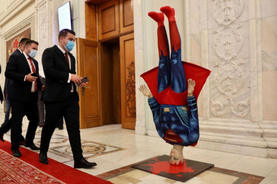 Az ülés elkezdése előtt a PSD-s törvényhozók pedig egy fejre állított Supermant állítottak az ülésterem elé. Ezzel arra a klipre utalnak, amelyet nemrég a miniszterelnök töltött fel Facebook-oldalára, Supermanként ábrázolva saját magát.