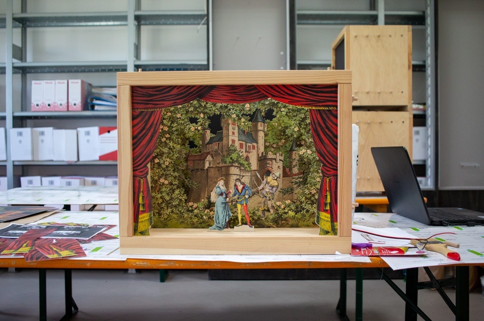 – szegeztük Császi Irénnek a kérdést, aki elmondta, a gyártók, Schreiber és Rigle reklámkiadványokban hirdették a kis színházakat, innen lehetett megvásárolni őket. Az elemek egy lapként érkeztek meg a családhoz, akik ollóval, szikével vágták ki a különböző részeket – szereplőket, háttérelemeket, oldalrészeket –, majd a használati utasítás alapján összerakták azokat. Minden előadáshoz járt egy szövegkönyv, ami mindig 16 lapból állt és párbeszédként dolgozta fel az adott történetet.