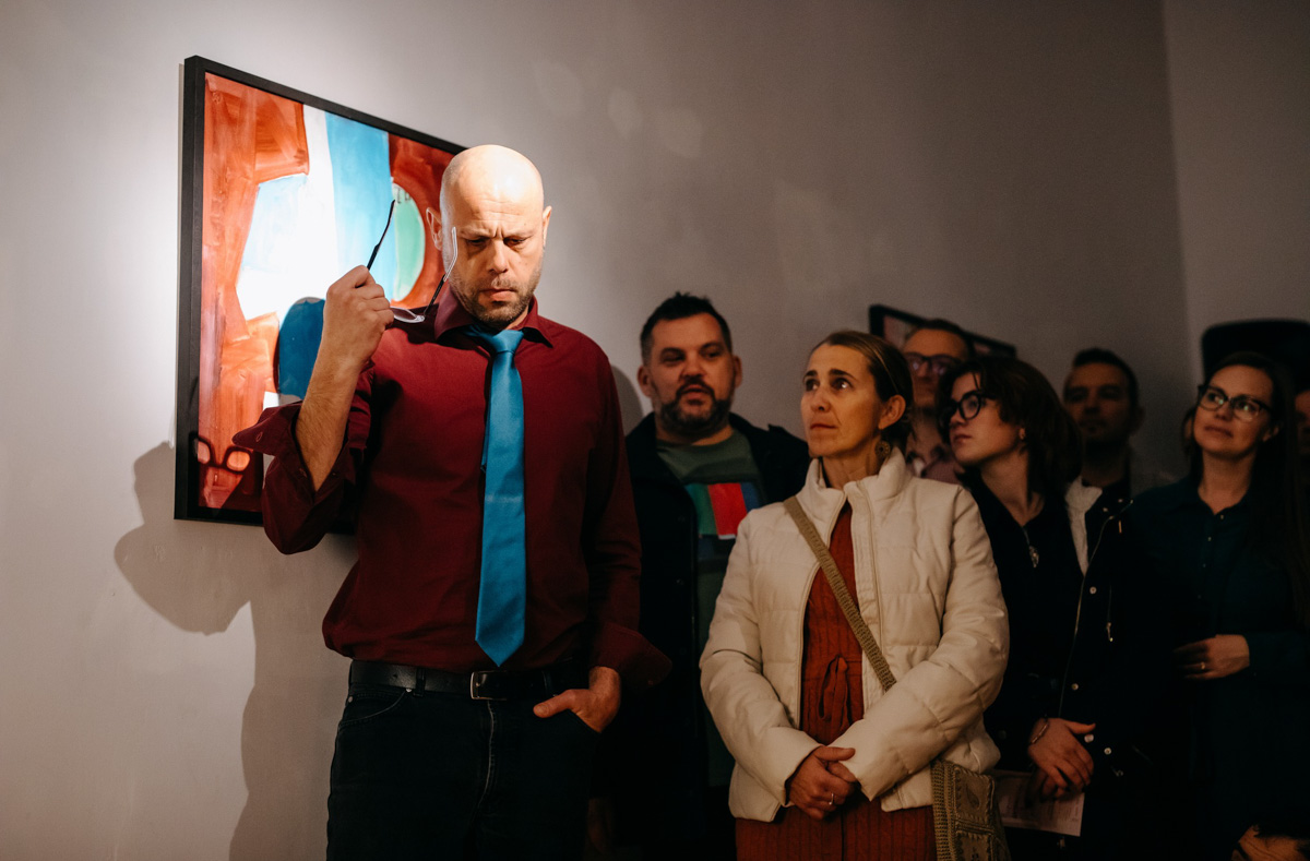 A balkon kertjében a márványborítású dobozban egy darab iporkát látok, a Kiragadás madártávlatában elszédülök. Közben arra összpontosítok, engem mi érint meg. A nagy piros vásznakat veszem észre előbb, rajtuk a bánffyhunyadi cigánypalotákra emlékeztető rajz. Az alkotó Siklódi Fruzsina, olvasom le a tábláról. S azon gondolkodom milyen groteszk, humoros, mégis megható történetek rejlenek a piros alapon sikló szürke vonalak között.