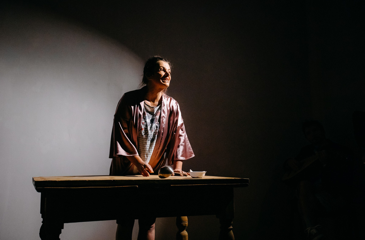 A háttérben Pál Attila lágy gitár játékba kezd, a színésznő az asztalon teszi jobbra, majd balra az eszközöket, mi, a nézők pedig legyeké válunk a falon Magyari Tekla újságíró otthonában – legalábbis én így tudom elképzelni, amikor meghallom, hogy a szövegben az édesanya beszél kisgyerekéhez. A mondókákat, gyerekdalokat, gyöngéd parancsokat, becézgetéseket, tanítgatást, a dicsérő szavakat, játékosságot amelyek az aprósághoz szólnak, meg-meg szakítják az édesanya saját magához intézett szavai.