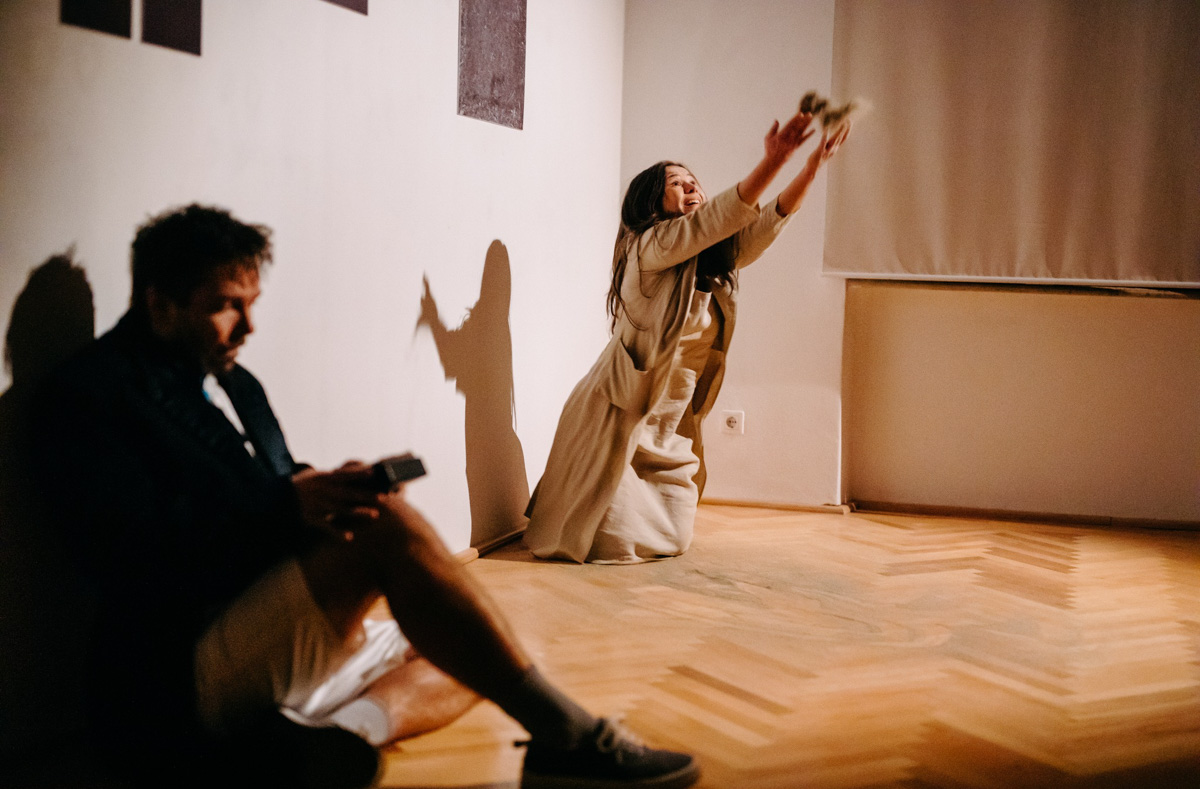 Egy újabb Balázs Imre József-verset hallunk, ezúttal Albert Orsolya előadásában. Az ihlet a Kiragadás fotósorozat, alkotója Lőrincz Inez. A falon több fekete-fehér fotó, néhány felülnézetből rögzíti – tippem szerint – az erdő talaját, másokon tárgyak szerepelnek: szög, toll, dióhéj, száraz falevelek, fadarabok, kavicsok, egy drót, toboz – csupa olyan dolog, amit össze lehetett gyűjteni arról a talajról, amiről felülnézetből készült a kép.