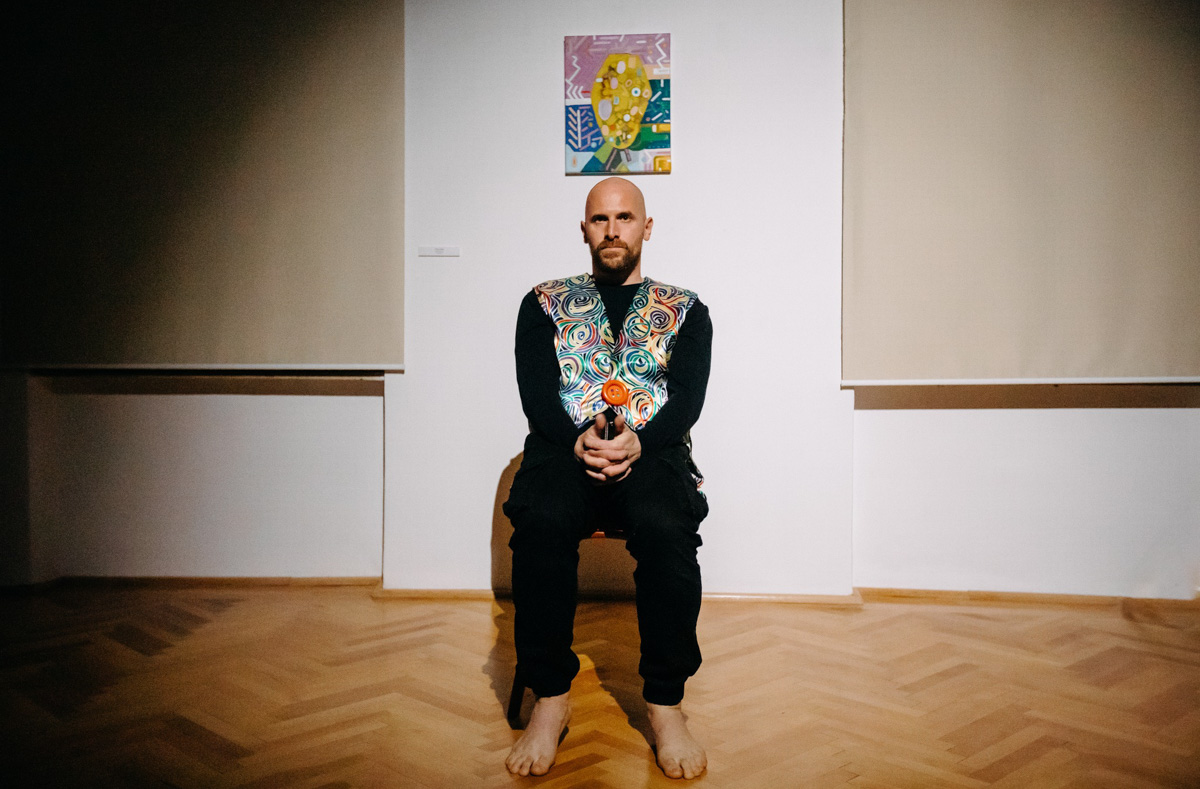 A festmény alkotója Fülöp József, Ruszuly Ervin táncos, koreográfus ihletődött belőle, aki egy piros széken ül, azt figyelem, hogy a ruházatával belesimul a mögötte lévő festménybe. Ismét Pál Attila festi alá zenével – nem látom, de csellónak hangzik – az előadást, ezúttal egy koreográfiát.
