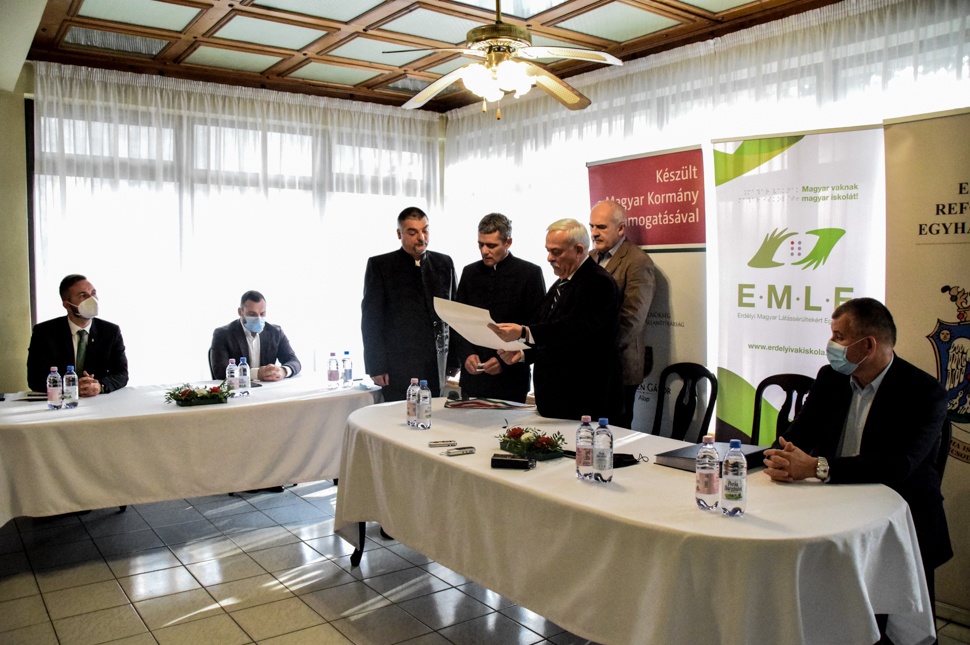 Az ingatalanokat az Erdélyi Református Egyházkerület vásárolta meg a magyar állam ötszázmillió forintos támogatásával az Ikos Conf. készruha-gyártó cégtől, majd átadta őket az Erdélyi Magyar Látássérültekért Egyesületnek (EMLE), így a sajtótájékoztatón Percze László konzul mellett az egyházkerület képviselői – Kató Béla püspök, Ballai Zoltán lelkipásztor, gazdasági előadótanácsos és Tőkés Zsolt főgondnok, illetve iskolaigazgató –, a EMLE elnöke: Butu Arnold Csaba és alelnöke: Máté Zsolt, de Gálfi Árpád polgármester és Hargita megye tanácsának részéről Bíró Barna Botond is felszólaltak.