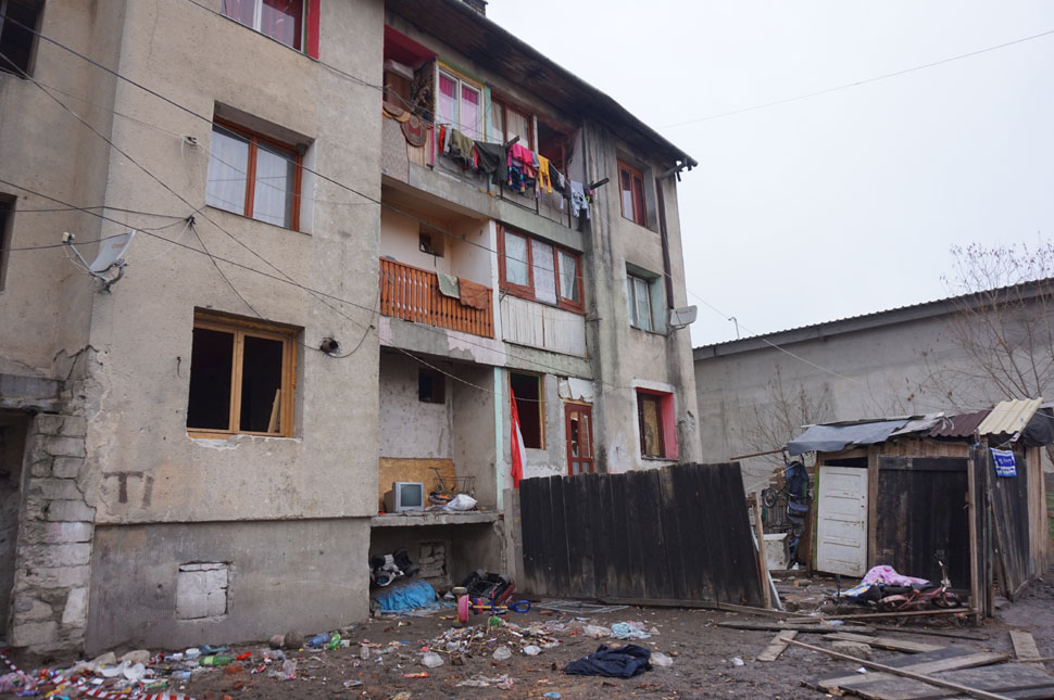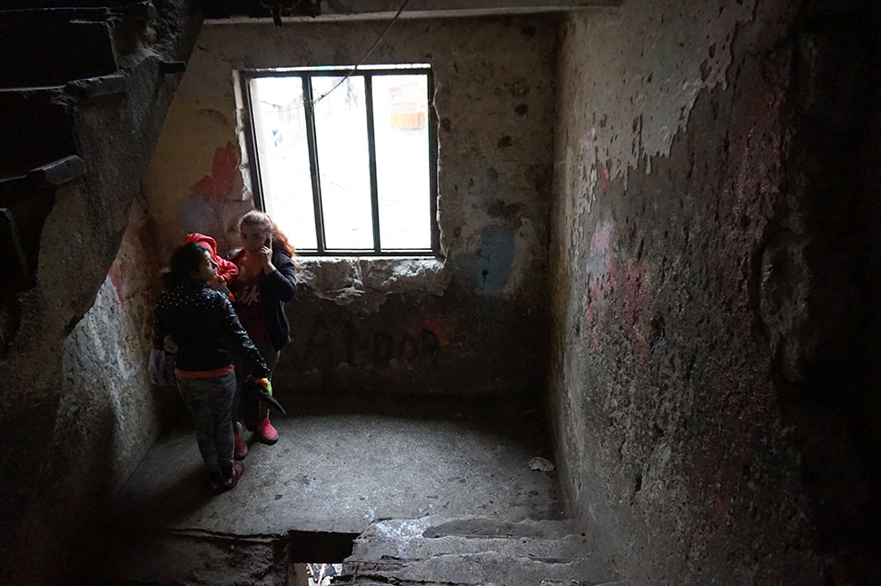 Felbotorkálunk azért az emeletre. Fekete falak között, korlát nélküli lépcsőn botorkázunk, a gyermekek mutatják az utat. Nyílik az ajtó, és vakítóan patyolat lakás tárul fel. Új, piros bútorok, csempe. Egy férfi kisbabával a kezében nyit ajtót, a többiek elhúzódnak. – Ne haragudjanak, nem nyilatkozunk.