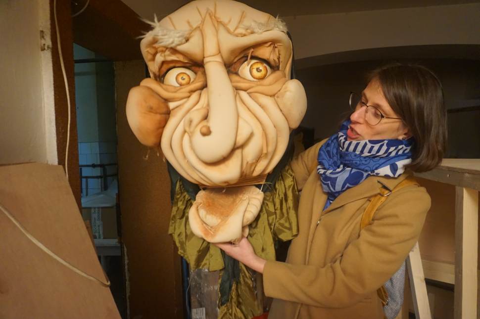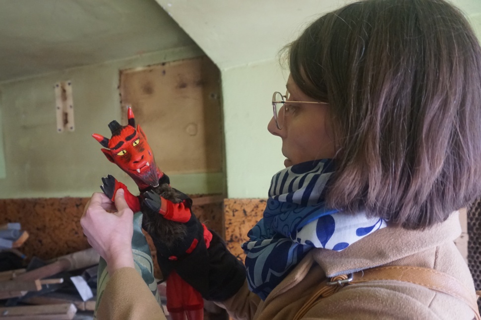– Hopp, ez pont az ördög a Rengeteg Ábel és Kürtős Kata kalandja bábelőadásból – bontja ki a zsákból a kesztyűbábot Emőke. – Ez a kesztyűbáb is groteszk: egyik keze lennebb, másik fennebb van. A feje fából készült, ahogy a vásári kesztyűbáboknál szokás azért, hogy ritmusjátékokat lehessen játszani velük, nagyon sokat kopolják a paravánon őket – mondja a Karácsony Kinga, a színház öltöztetője és sminkese által tervezett bábról.