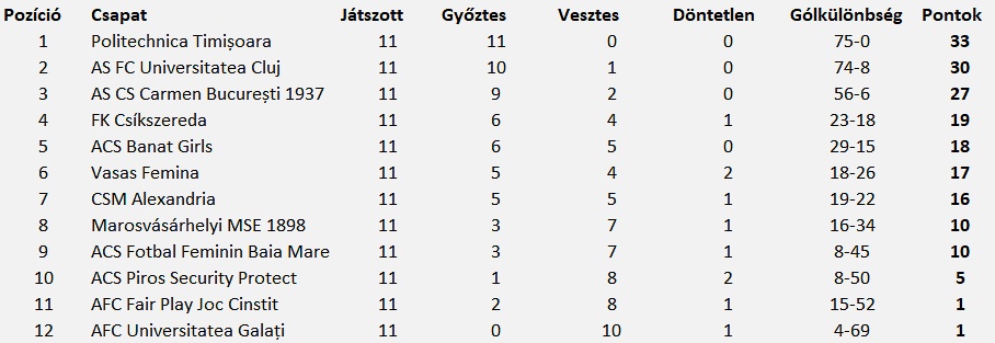 Kisorsolta az elsőosztályú női labdarúgó bajnokság tavaszi menetrendjét a Román Labdarúgó Szövetség hétfőn, január 16-án Bukarestben. A bajnokság felső- és alsóházi rájátszással folytatódik, a 11 fordulós alapszakasz tabellájának első hat helyét elfoglaló hat együttes a bajnoki címért, a mezőny hátsó fele a kiesés elkerüléséért küzd március 4-től kezdődően.