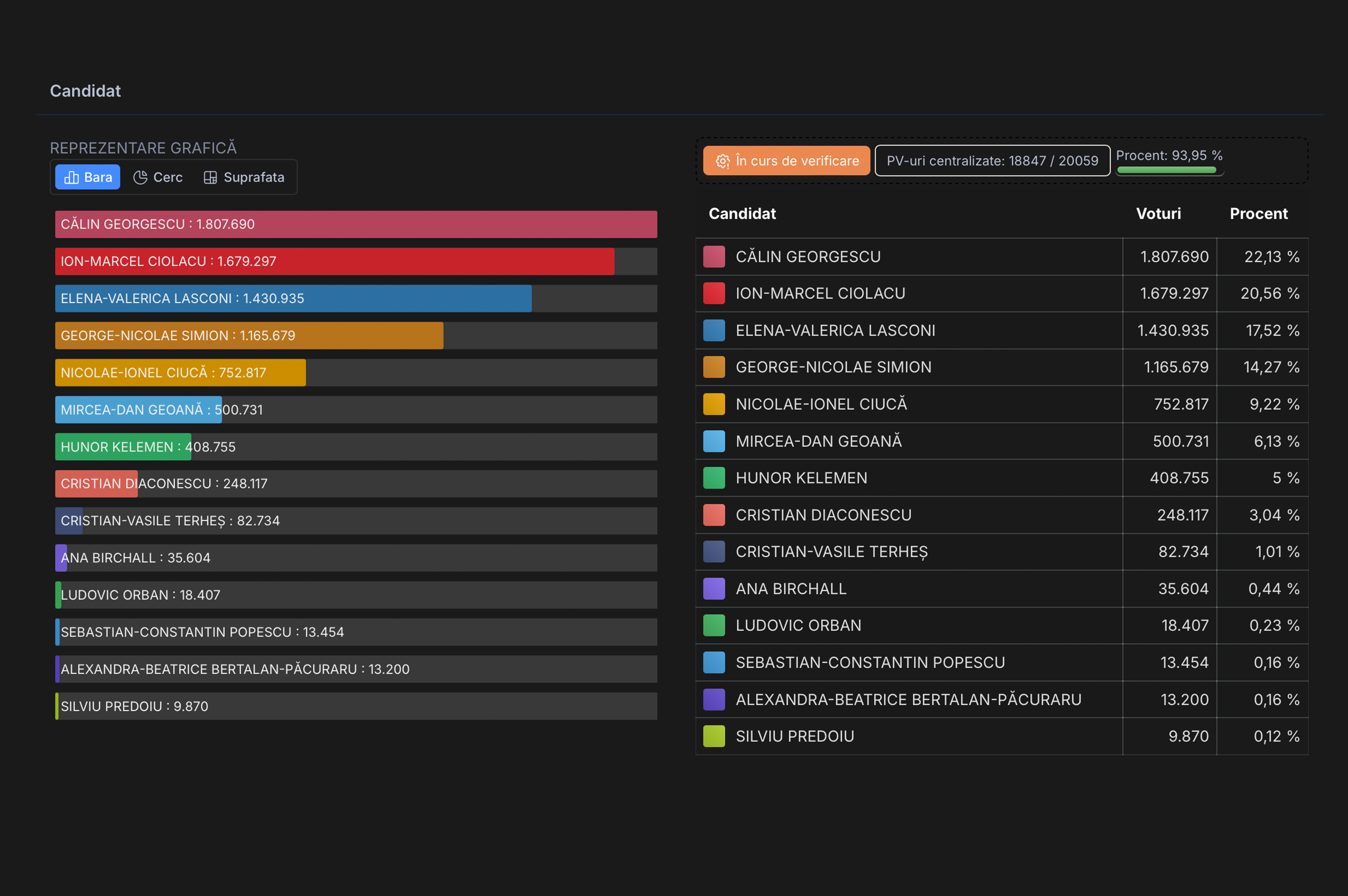 A prezenta.roaep.ro oldalon élőben követhető eredmények szerint szoros küzdelem zajlik Marcel Ciolacu és Călin Georgescu között. Az adatok 82,4 százalékos feldolgozottságánál Georgescu a szavazatok 22,08 százalékát szerezte meg, míg Ciolacu 22,05 százalékon áll. A két jelölt között mindössze körülbelül 2000 szavazatnyi különbség van, Georgescu javára, aki korábban esélytelennek tartott független, ex-AUR-os jelöltként indul a választáson.