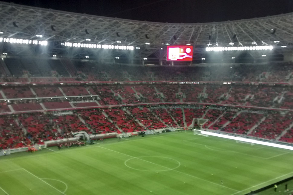 Az egy négyzetméterre eső szelfik száma megugrott a piros-fehér-zöldben pompázó stadion előtt. Jelentem, mi sem maradtunk szégyenben. Hatalmas az épület, külső formája visszahozza egy kicsit a Népstadiont az oszlopok meg a főbejárat épülete miatt.