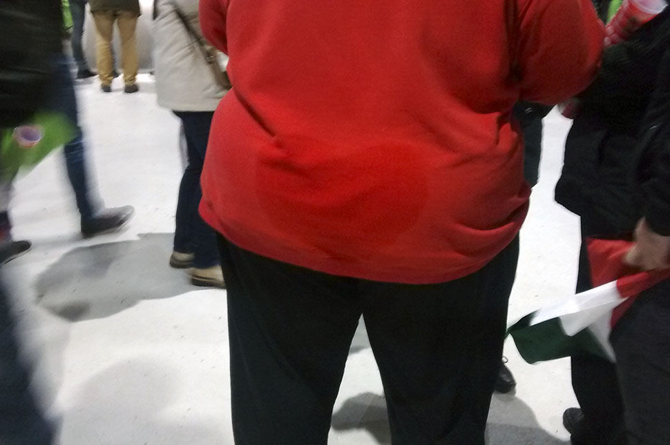 A szektorunkba lépve nem hagytak sokat csodálkozni, mellettünk termett egy zöld ruhába bújt önkéntes, aki szeretett volna a helyünkre kísérni minket. De ekkor még nem látogattuk meg a büfét, hogy feltankoljunk az első félidőre, beálltunk ezért a sor végére.