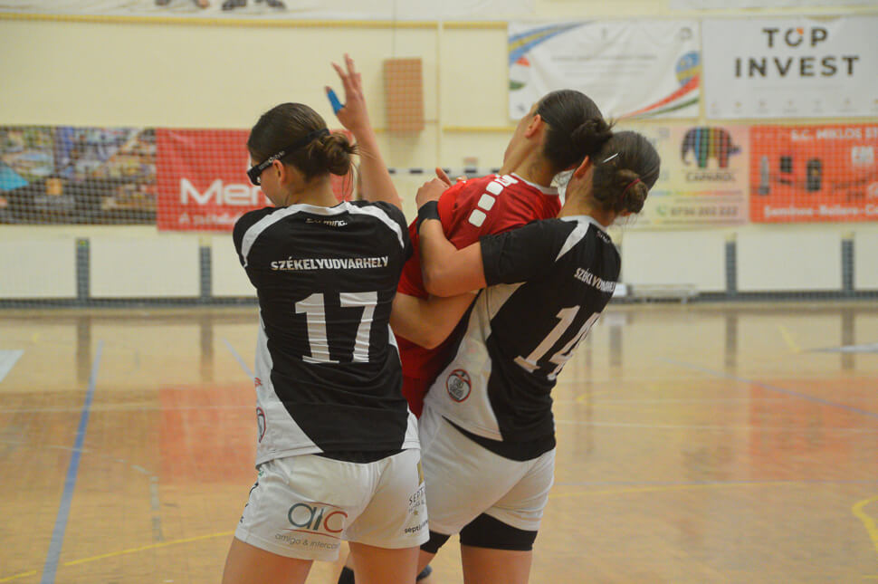 Gergely Nóra találatával a 25. perben egyenlített az ekkor már Mesterrel a kispadon kiegészülő udvarhelyi csapat, de a félidő vége a vendégeknek jött ki jobban. Hiába, hogy Bíró Melinda nagyszerű teljesítményt mutatott a kapuban, a gólszerzéssel akadtak gondok. Nóra, Flóra és Enikő lövései sem találtak utat a hálóba, több lövés is a kapufán csattant, Dénes Szidi hétméterest hibázott, miközben a túloldalon háromszor is eredményesek voltak a vendégek, így a félidő végén 13-16-ra módosították az eredményt.