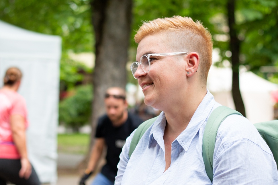 Első utunk a parkban felállított kis színpadhoz vezetett, Simon Mária Tímea legkedvesebb városnapi helyszínére. „Még 2018-ban én bábáskodtam a felett, hogy itt a parkban legyen bármi is. Az előtte való évben volt egy elég rossz tapasztalatom a gyermeknappal. Régen csak a minifoci pályán zajlott a rendezvény, itt a parkban pedig volt egy Waldorf-os csoport. Megirigyeltem őket, hogy a jó árnyas fák alatt nemezelnek, mi pedig ott a napon süttetjük magunkat. A következő évben a városháza szervezési irodájával az egész gyereknapot ide képzeltük, és 2018-tól az Udvarhely Napokon is állandó helyszín lett a kicsi színpad, de már 2017-ben volt civil város a parkban.