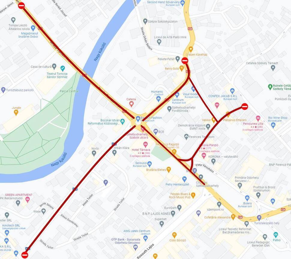 Reggel hat órától lezárják a Kossuth Lajos utcát és a II. Rákóczi Ferenc utcát a körforgalomig, 17 és 23 óra között a Márton Áron teret. 22 órától 24 óráig a következő útkereszteződéseket és az azokhoz tartozó utcákat: Városháza tér és Vár utca kereszteződése, Petőfi Sándor és Vár utcák kereszteződése, Tomcsa Sándor és Petőfi Sándor utcák kereszteződése, Sziget és Tamási Áron utcák kereszteződése, Tamási Áron és Mihail Kogălniceanu utcák kereszteződése.