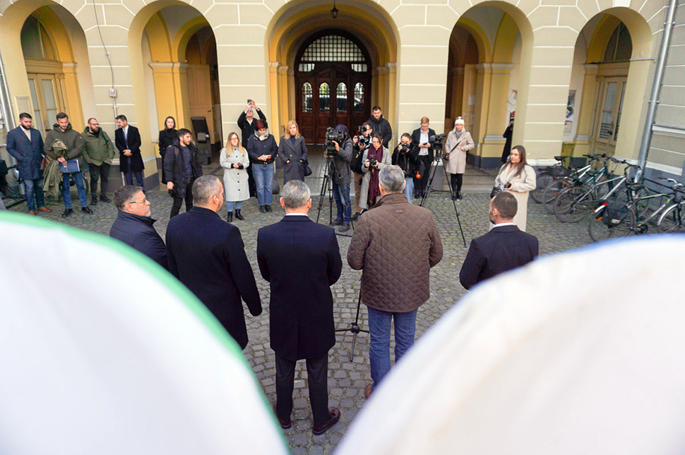 Na de örülünk, hogy ezúttal meghívták az uh.ro-t is a sajtótájékoztatóra, és annak is, hogy csak 15 percet gondolkodhattunk egyik lábunkról a másikra ugrálva a hidegben, mert érkeznek is a politikusok.
