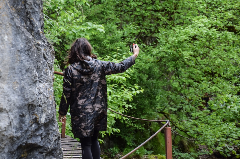 Az Almási-barlang felé tett első lépések is rögtön megörökítésre kerülnek. Jobb láb emel, egyszerre lép és egyformán mosolyog. Talán ez lehet a titka a tökéletes csoportszelfinek, melyre ha rákerült a #visitharghita hashtag, mehet is fel a közösségi oldalakra.