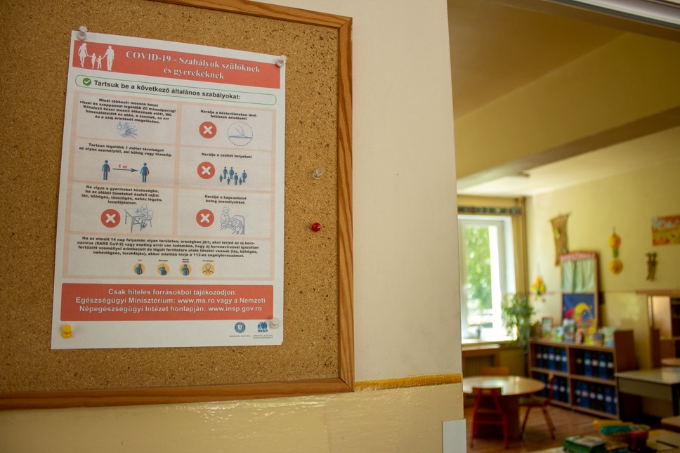 Már az udvaron táblácskák fogadnak: a be- és kifelé utat jelzik a szülőknek, de a szokásos plakátok sem maradnak el, melyek a kézmosásra, a távolságtartásra emlékeztetnek. Az ajtóban egy védőruhás nő fogad, és arra kér minket, hogy használjuk a fertőtlenítő lábtörlőt. Amíg előhalásszuk a maszkokat a táskáinkból, addig megméri a lázunkat, és megmutatja merre találjuk a kézfertőtlenítő adagolót, majd az Eszterlánc Napközi igazgatónőjéhez, Koncz Melindához irányít.