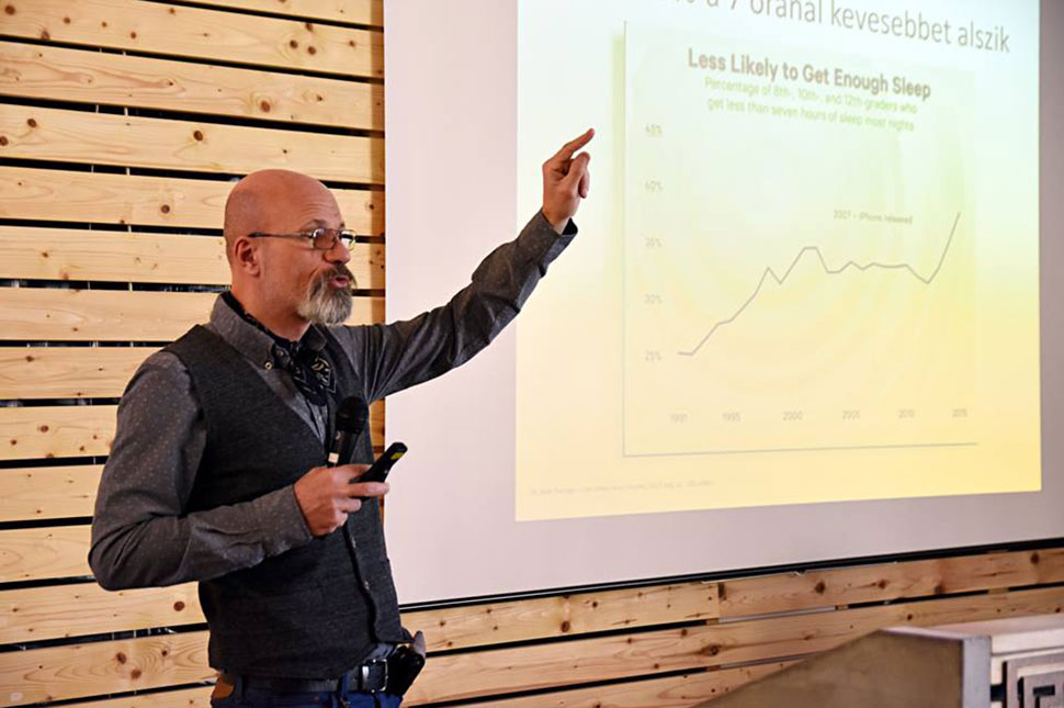A fiatal korosztály az élete során 5 év és négy hónapot smartphone-zombiként fog eltölteni, lehajtott fejjel, a két hüvelykujjának a mozgatásával - mutatott egy másik statisztikát az előadó, de megjegyezte azt is, a közösségi médiában eltöltött idő hasznos is lehet.