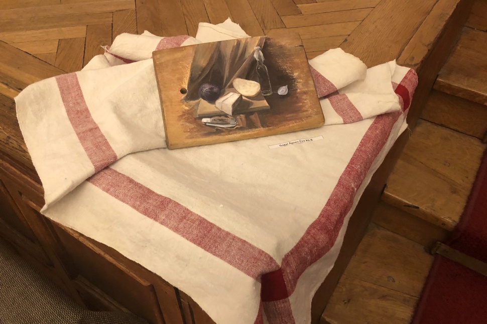 Szalonna és hagyma, kenyér, pálinka – már a bejáratnál hagyományos falatokkal várják a látogatót, de lesz itt önarckép, ajtókopogtató, hímzett Converse, festett bakancs és teáskanna, rengeteg izgalmas linómetszet.