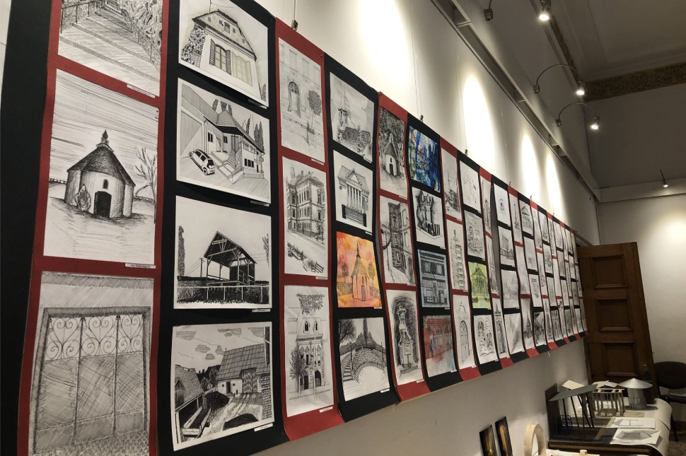 Az előtérben pedig, ahol a színházból szoktunk kijönni, és időnként más kiállításokat is megnézni, az építészet szakosok művei láthatók: székelyudvarhelyi képeslap-alapok, utcai bútorok,
