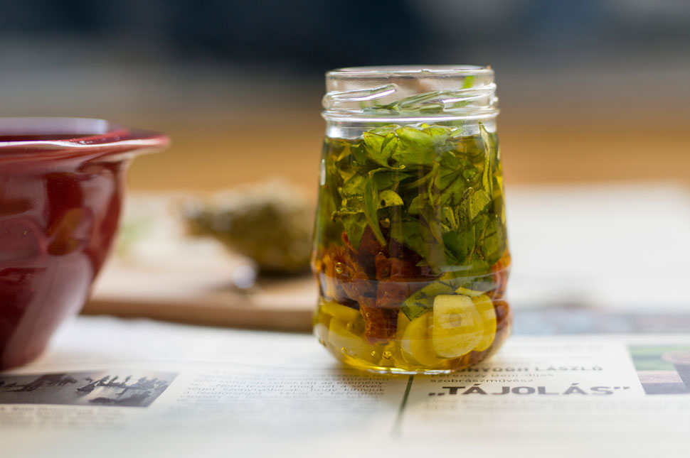 Picire vágom a leveleket és a paradicsomot, és felszelem a fokhagymát is, ezeket rétegezve, mindenféle méricskélés nélkül üvegbe teszem. Be a hűtőbe, nehezebb napokra. Egy másik részét viszont robotgéppel összezúzom, ezt használom a vendégváró falatkák és a tésztám ízesítéséhez.