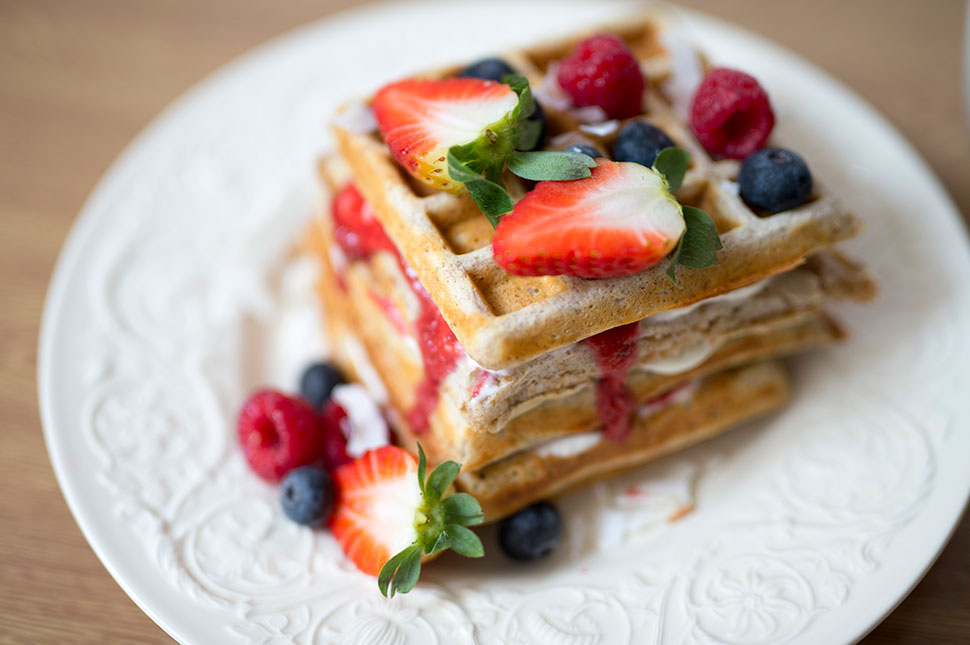 Ha kész a gofri, akkor megkenjük a krémünkkel, a friss eperszósszal, majd jöhet egy újabb gofri, krém, lekvár és így tovább. A reggelinket friss gyümölcsökkel, kókuszchipssel, magvakkal tálaljuk.