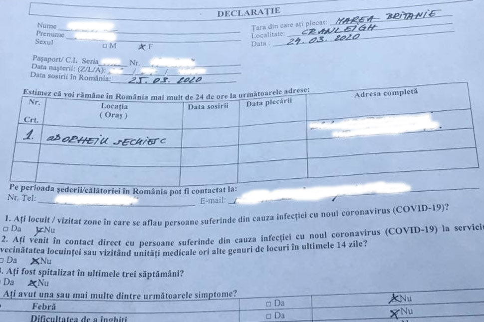 Amikor a román oldalra megérkeztünk március 25-én, szerdán éjszaka, ki kellett töltenünk egy nyilatkozatot. A személyes adatok mellett azt is bele kellett írni, hogy mikor indultunk el, mikor érkeztünk meg a határhoz, honnan jövünk, hova megyünk, minden országot, amin átjöttünk és oda kellett írnunk minden várost is, amit hazafelé érinteni fogunk, tehát pontos útvonalat. Volt egy ikszelős rész a tünetekre vonatkozóan. Lázat nem mértek, bármit mondhattunk volna. Be kellett írnunk, hogy hol szeretnénk tartózkodni Romániában, mi beírtuk a házi elkülönítést. Be kellett írnunk a címet, hogy mikor érkezünk oda, és hogy ki visz el engem ehhez a lakcímhez. Mi a másnap reggelt írtuk be, amitől számítva két hétig kell elkülönítésben lennünk. Nekem azt is be kellett írnom, hogy tizedikén hazaköltözöm abból a lakásból, amiben most vagyok, a szüleimhez.