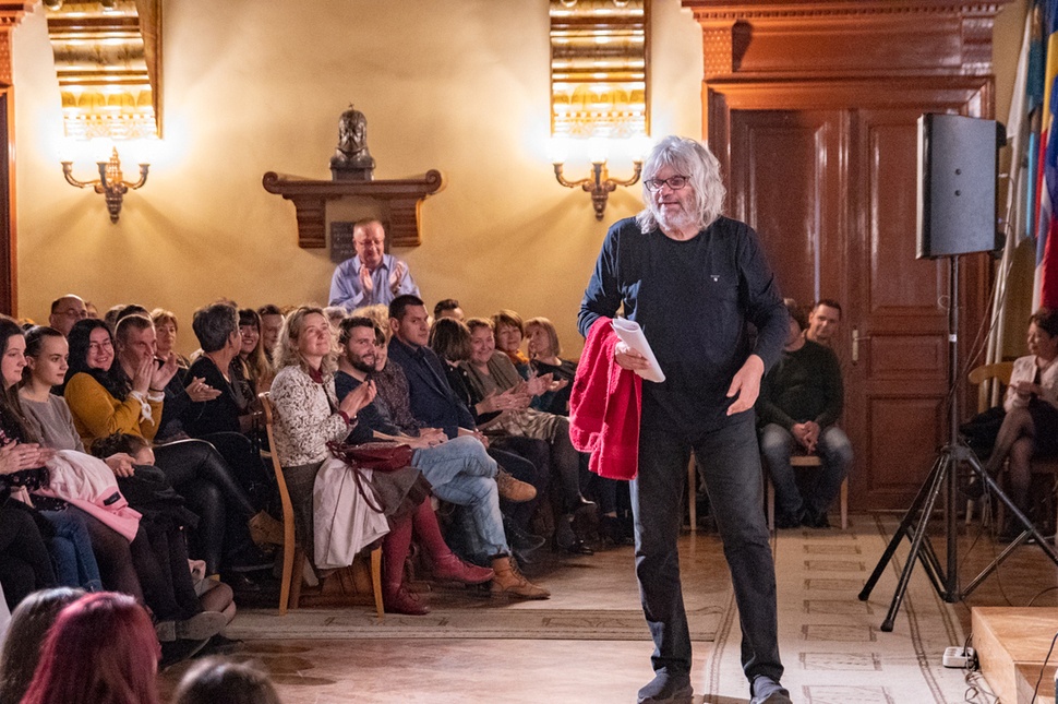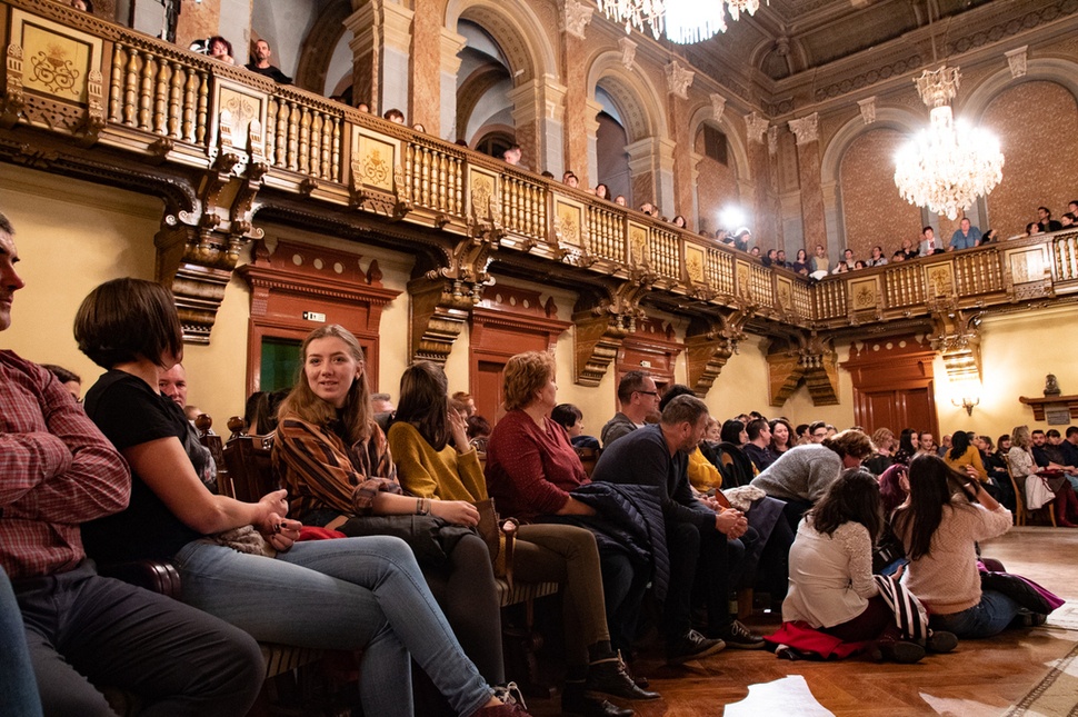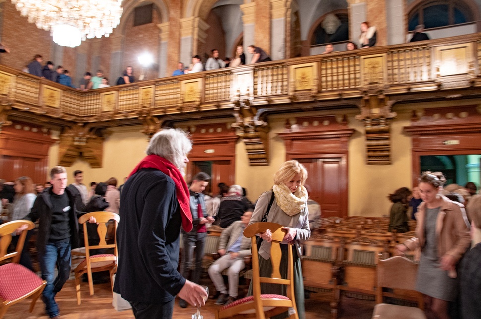 Már a városháza bejáratánál aggasztó mondatfoszlányokat csentem el: megteltek a helyek, a szervezők pedig kénytelenek más helyiségekből áttelepíteni ülőhelyeket. Folytattam az utam a Szent István felé, ahol valóban nem voltak már szabad helyek. Azaz voltak, csak a jól bevált kabátleterítős módszerrel foglalták őket. Nem kellett sokat várni, előkerültek a pótszékek is. Bár nem az összes – panaszkodott egy hölgy a hátam mögött, aki úgy vélte, számíthattak volna a tömegre, és kihelyezhettek volna néhányat az összecsukható fekete székekből is a színpad két oldalára.