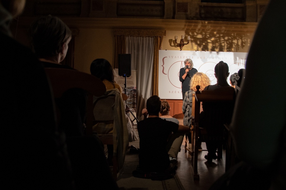 Aztán megjelent az énekes a színpadon, aki miatt még annak ellenére is dugig telt a terem a székelyudvarhelyi nézőkkel, hogy a teljes Ady-album már öt éve fent van a Youtube-on. Nem kezdte el az előadást, először a nézőiről és azok kényelméről gondoskodott – és előkerült az oldalsó teremből még jó néhány szék.