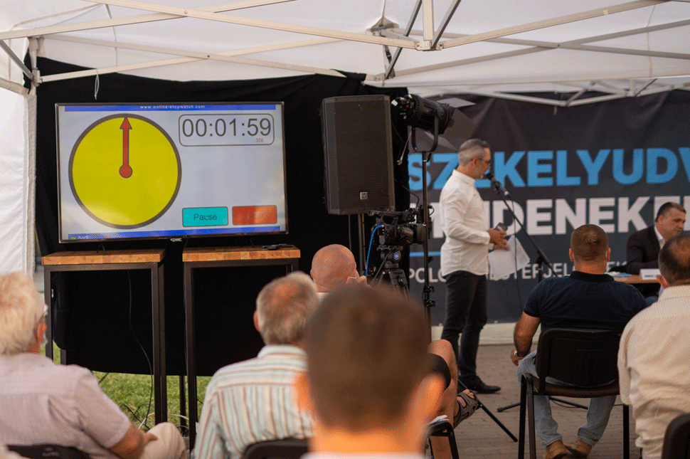 Maszkot fel, kezdődik! Bemutatkozik a légiós moderátor, Grubisics Levente, a Sepsi rádió főnöke és ismerteti a naaagy udvarhelyi választási vita szabályait: az idő kötelez, a taps szabad, a bekiabálás nem.