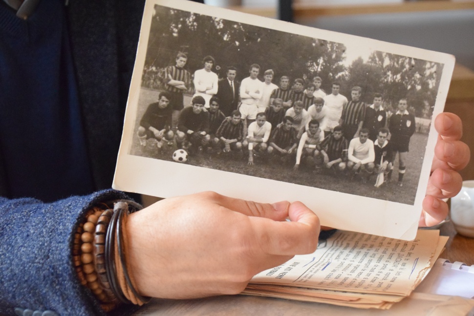 „Gyula bácsihoz, a testvéréhez most is ellátogattam. Ők ikrek voltak és most is volt olyan, hogy egy bizonyos fényképet nézve mondtam neki, hogy ez Laci bácsi, nem maga. Egy idő után annyi időt eltöltesz ezekkel az emberekkel, hogy már arról, hogy melyik lábával lő, felismered. Itt vannak mind a ketten a búcsúmeccsükön ’82-ben, itt meg Bálint Feri bácsi, amikor Brassóban a legmagasabb szinten játszott, öt évet. Az ő karrierje is érdekes” – mutogatja a fényképeket Zoli.