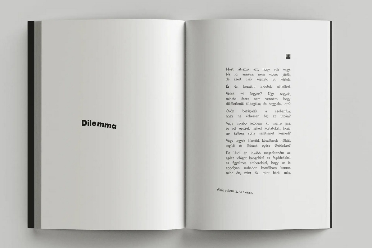 Bence márka és marketing területeken dolgozik vizuális szakemberként, de rendkívül sokoldalú vizuális művész, fotóz, kalligráfiával foglalkozik, a hétköznapi munkájában azonban nem ez jelenik meg elsősorban. Évekkel ezelőtt megtalálta őt egy felkérés, hogy legyen egy kötet tördelője, majd ugyanaz a szerző, Dávid István még egy munkára felkérte, ez lett az Isten szótagolva című kötet, ami Szép Magyar Könyv-díjat nyert 2022-ben. Tavaly, amikor már nagyon izmos volt az elgondolás, hogy szeretnék saját könyvet, felhívtam Bencét, hogy mi lenne, ha… Azt mondta, hogy nagyon szívesen, de az a feltétele, hogy szabad kezet kapjon. Természetesen beleegyeztem, ehhez ő ért.