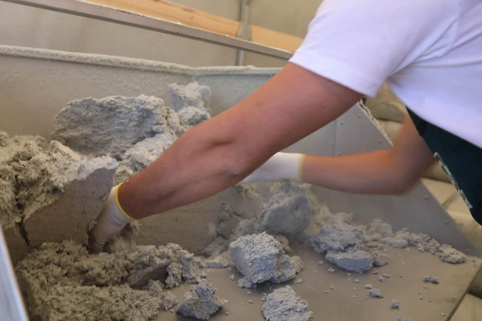Ha megvan a papír, egy hatalmas kalapácsos darálóba lapátolják, amiből már kisebb darabokban jön ki, mint ahogy bement, majd egy újabb darálóba utazik a futószalagon. Innen még apróbb darabokban távozik: a legnagyobb részkecskék nagyjából lencsényi cafatok, ekkor a termék nagyjából a vattára emlékeztet. Ehhez jön hozzá a borax és borsav keveréke, ezek felelnek a tűzállóságért és tartják távol a penészt, a kártevőket, rágcsálókat.