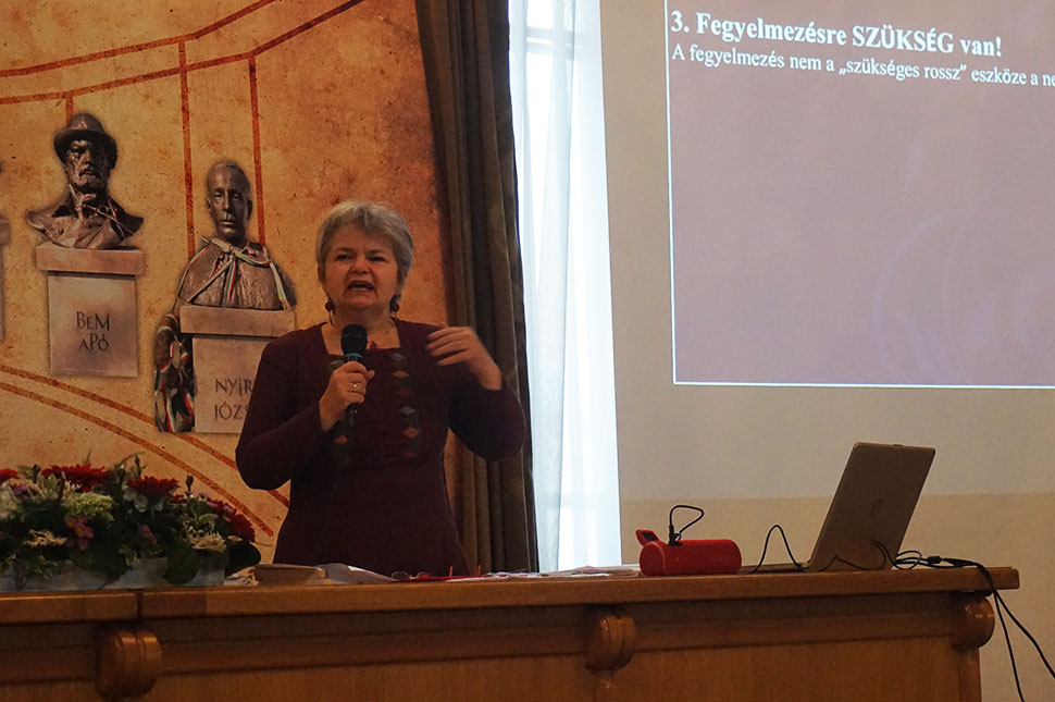 Olyan módszerekről beszélt, amiket bármikor elkezdhetnek használni a pedagógusok, szülők. Kihangsúlyozta: nem tanácsokat, törvényeket oszt meg az egybegyűltekkel, és azt is kiemelte, hogy akármilyen furcsa, fegyelmezéssel nevelhetünk szabadságra.