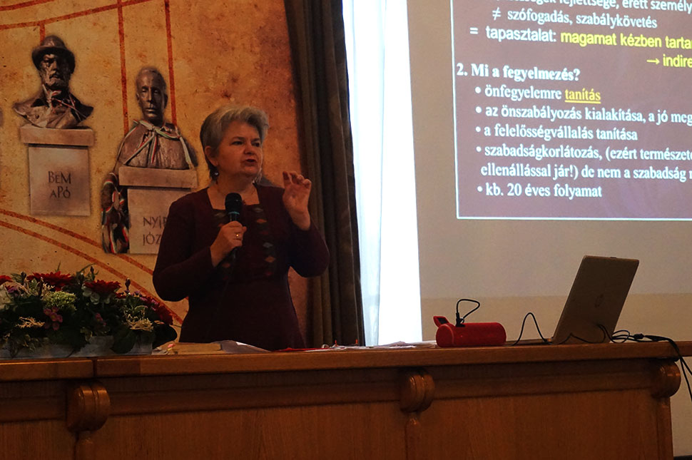 A legfontosabb cél, hogy szabadságra neveljünk, „ma nincs ennél fontosabb, egy tömegtársadalomban élünk, ha bólogatásra nevelünk, azzal azt fogjuk elérni, hogy ma nekünk bólogat a gyerek, amikor kikerül a világba, ott bólogat, és mindenhol bólogat majd egy kicsit. Hát már a saját családunkban sincs olyan, hogy mindennel egyetértünk, akkor miért bólintanánk mindenre?” – kezdte előadását Uzsalyné Dr. Pécsi Rita.