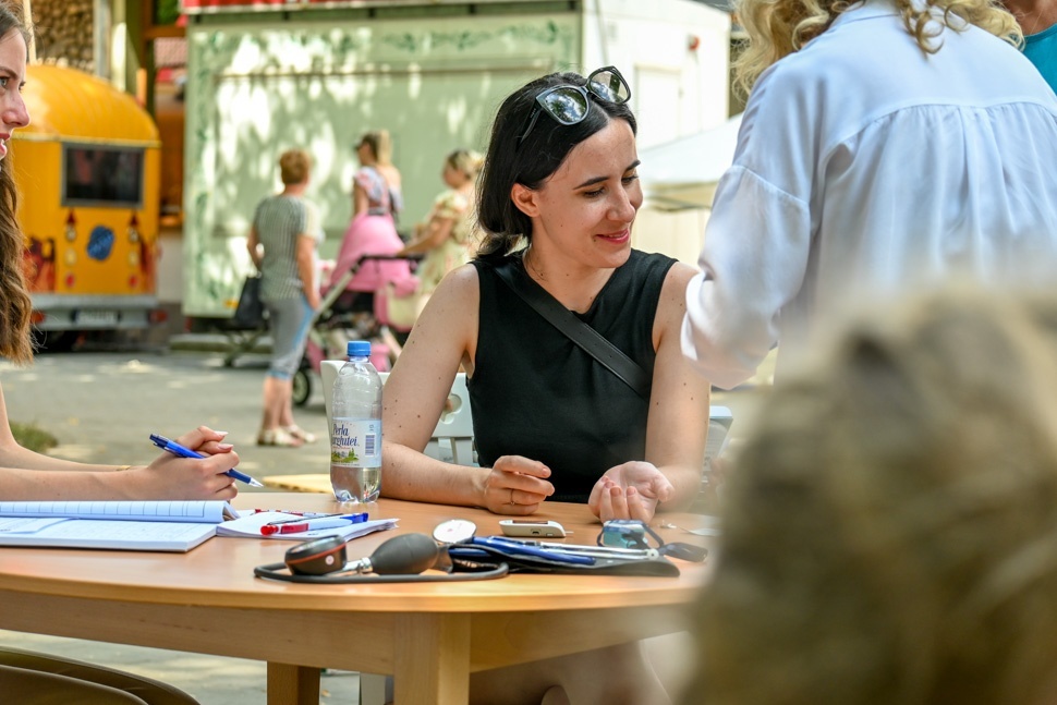 A programok még csak most éledeznek, a hőség sem segít. A filagóriánál a Városi Kórház nyárkék pólóba öltözött munkatársai invitálnak az asztalukhoz, kipróbáljuk, amivel készültek: vércukorszintet, véroxigénszintet és vérnyomást fognak mérni.