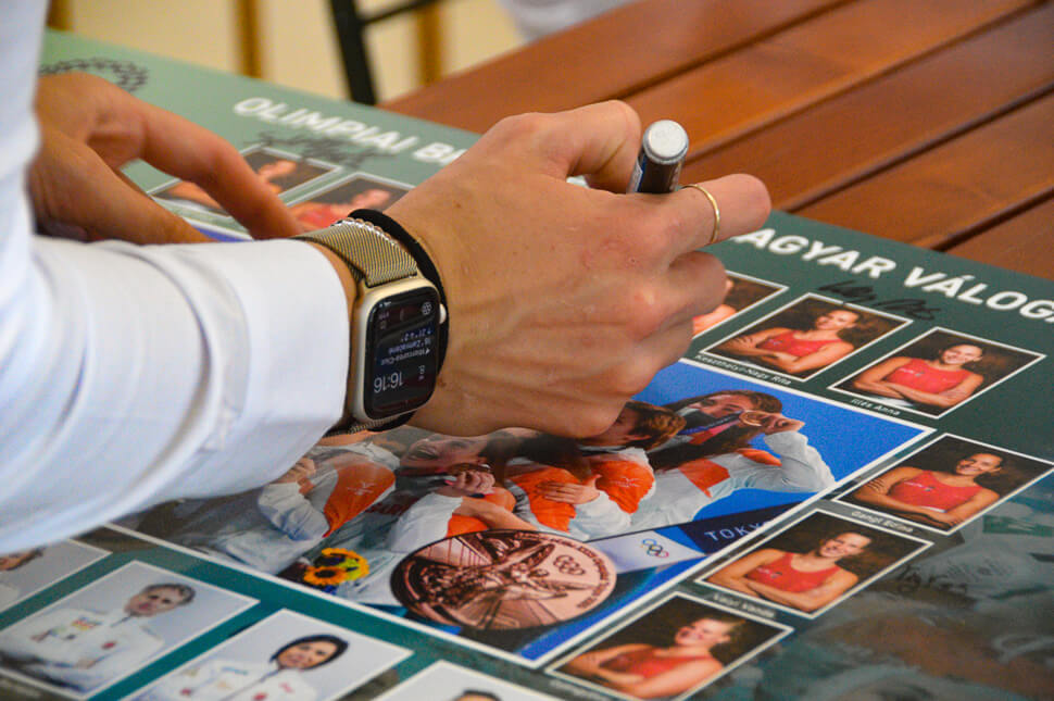 Rybanska Natasáék egy hatalmas tokiói tablót írnak alá, néhány labdát, ami itt is marad ajándékban, ahogy a szövetség által küldött ajándékkosár is, és Bíró Attila saját készítésű vörösbora.