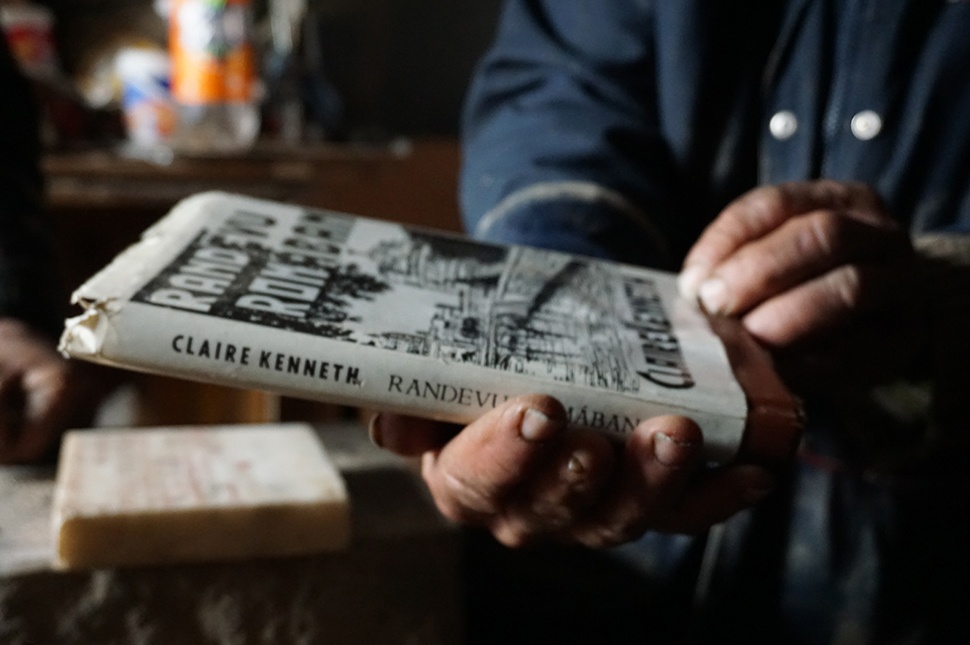 – Magyar kollégák láttak el könyvekkel minket, szeretünk erősen olvasni. Elmondom az egyik bölcsességet, amit követünk itt, a ligetben. Nem jó, ha egy helyen tartunk mindent, mert ha tolvajok jönnek be, akkor elviszik az egészet egyszerre. Ha szotyogtatva van imitt-amott, akkor nem lelnek rá. De, minek is kellene polcra rakni a könyveket, milyen jó, ha helyben van az olvasnivaló, s akárhol bele tudok lapozni – magyarázza Lajos, majd belelapoz a könyvbe, közben a Kelemen Hunoros könyvjelző kiesik belőle.
