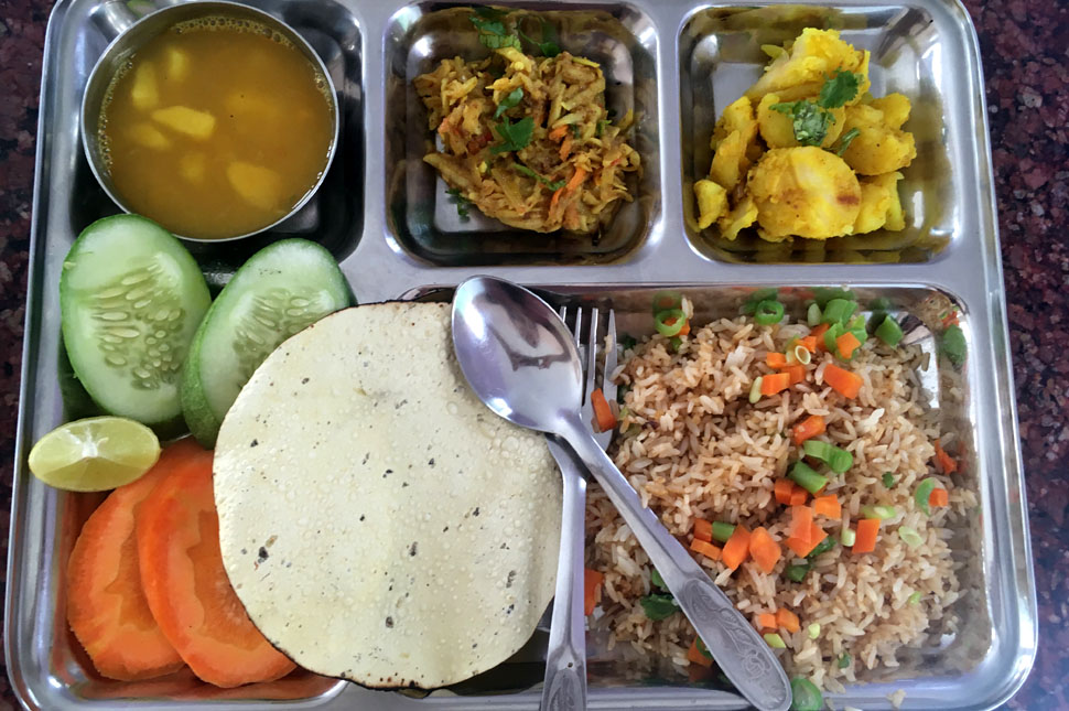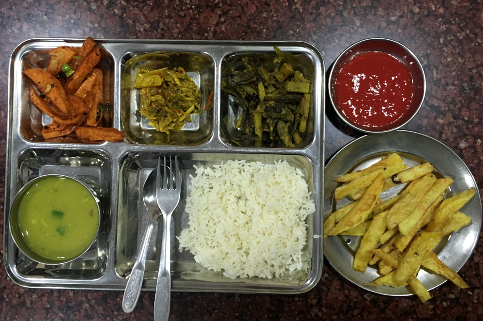 Vacsorára Dal bhat. A Dal a hüvelyes zöldségeket, a bhat a rizset jelenti. A szalmakrumpli és a saját készítésű ketchup kedvességből készült.